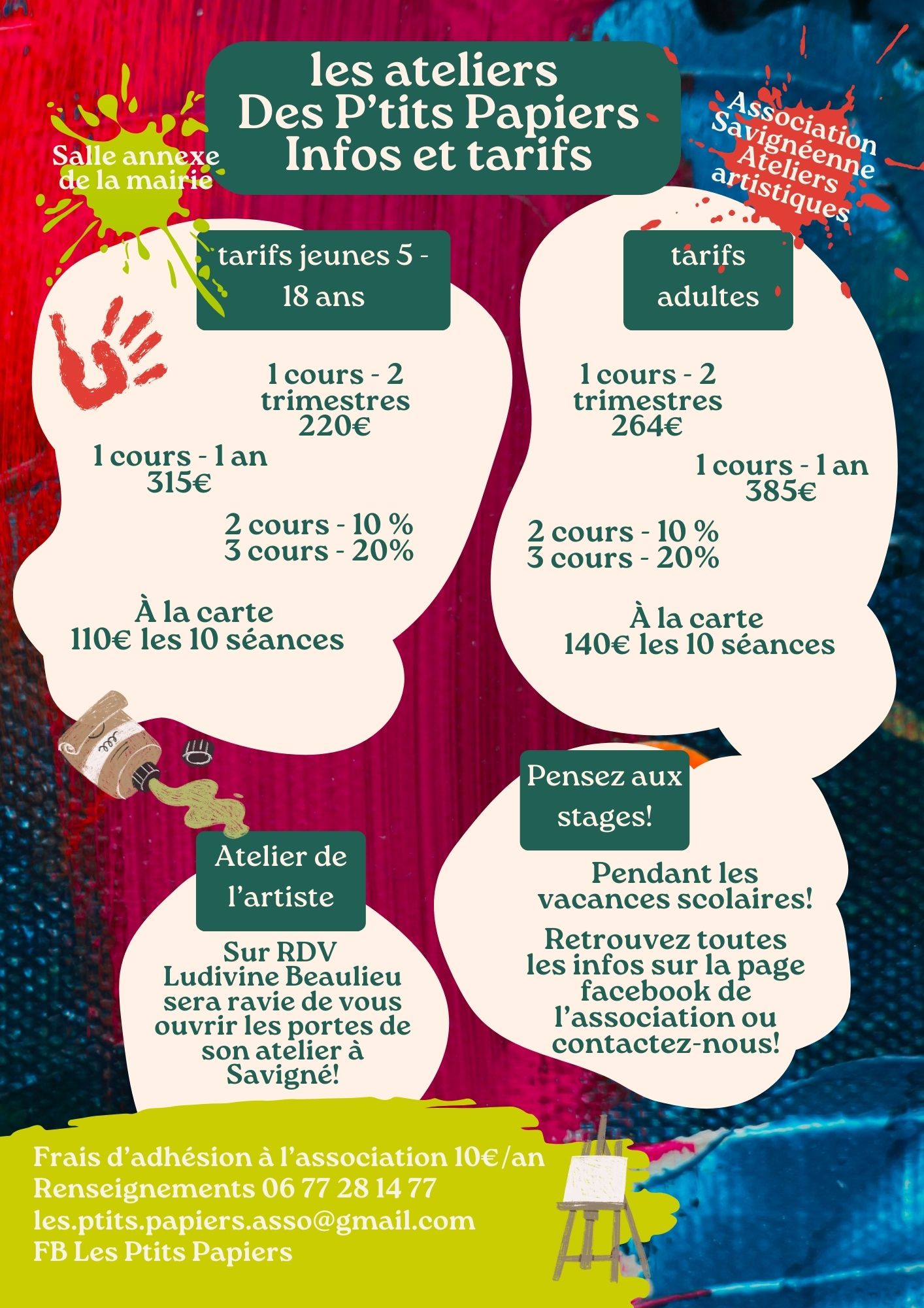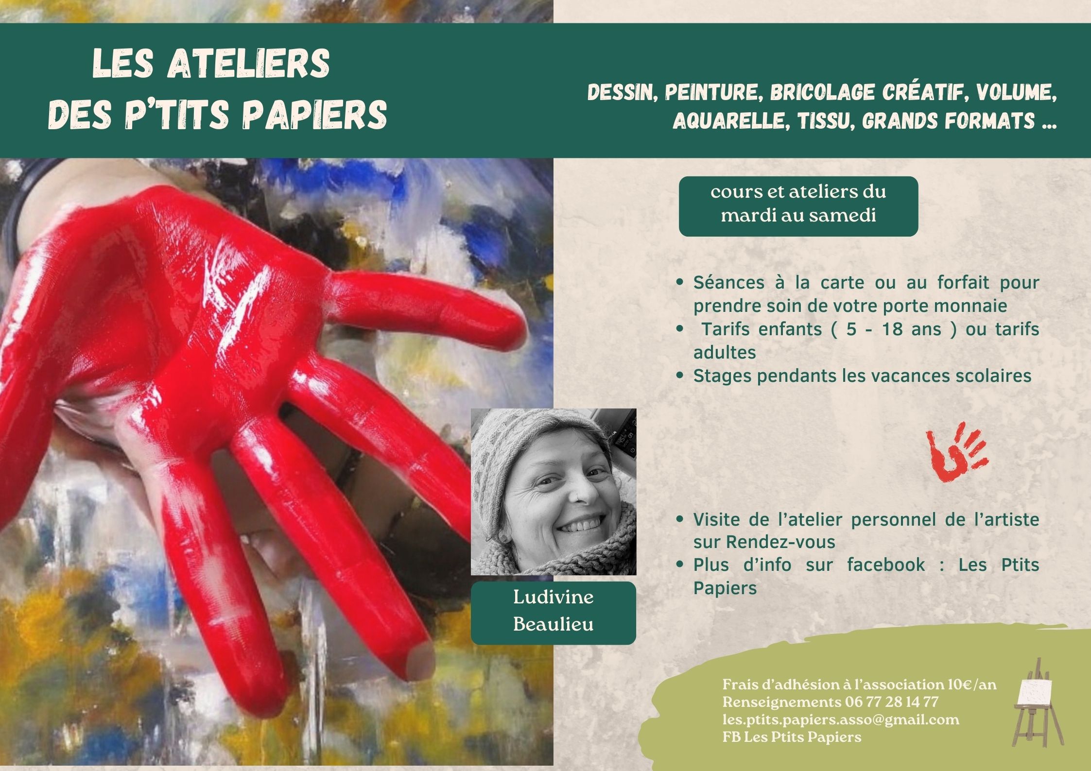 L’association Les P’tits Papiers propose des ateliers de pratique des arts visuels pour tous publics et tous niveaux. Dessin, peinture, volume, bricolage créatif, grand format, aquarelle.
